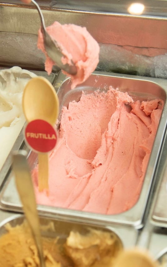 Una tarde, una mamá nos preguntó: “¿Por qué su helado de frutilla no es rosado fosforescente?” Le mostramos el proceso y la frutilla lista para hacer el jugo. Ese rosado pálido es el color verdadero de la fruta. Aquí no “pintamos” el helado; lo dejamos hablar.